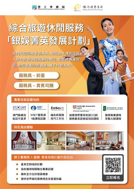 【本報訊】勞工事務局(下稱“勞工局”)與銀河娛樂集團(下稱“銀娛”)合作推出“銀娛菁英發展計劃(酒店營運)”(下稱“計劃”),以“先入職、後培訓”方式,協助本澳居民提升專業技能與促進其職業生涯向上流動,該計劃由明(10)日起接受網上申請。