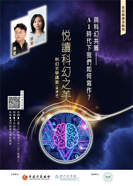 【本報訊】為響應國務院今年首次設立的“全民閱讀活動周”及聯合國教科文組織訂定的“世界讀書日”,由中國作家協會與澳門科學館共同主辦、教業中學協辦的《悅讀科幻之美》科幻文學講堂將於4月22日(星期三)下午4時30分在教業中學何賢堂舉行。兩位內地青年科幻作家靚靈與羅夏將親臨澳門,以“與科幻共舞——AI時代下我們如何寫作?”為主題,與青少年探討人工智能浪潮下科幻文學創作的變革與挑戰。歡迎公眾屆時透過中國作家網、澳門科學館facebook專頁或該館的YouTube頻道觀看活動直播。
