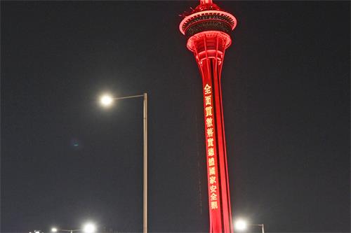 澳門旅遊塔播放國家安全宣傳教育標語。