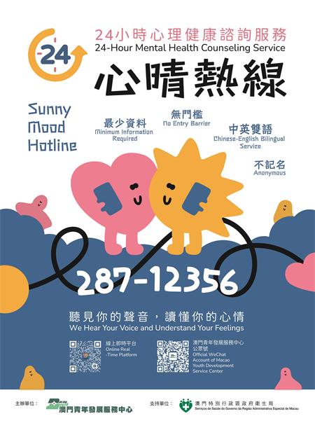 【本報訊】澳門青年發展服務中心(下稱“青服中心”)積極推動“心晴熱線287-12356”走進社區,通過多元化互動體驗、社區路演及專題講座等形式,向廣大市民普及身心健康知識、傳遞關懷,把服務融入市民日常生活。“心晴熱線287-12356”由澳門衛生局與青服中心聯合設立,是一條中英雙語24小時的心理健康諮詢熱線,專為市民提供即時情緒支援服務。該服務遵循“不記名、最少資料登記、不設任何門檻”的原則,為有需者提供專業、適切的聆聽與支援。