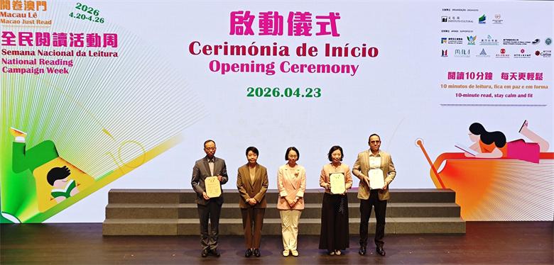 【本報訊】為積極響應國家《全民閱讀促進條例》將每年4月第四周定為“全民閱讀活動周”,以及423日“世界閱讀日”,由澳門文化局、教育及青年發展局及社會工作局主辦,聯同多個政府部門及民間社團共同舉辦的“開卷澳門‧2026全民閱讀活動周”(以下簡稱“全民閱讀活動周”)於今(23)日上午在澳門文化中心小劇院舉行活動啟動儀式。活動以“閱讀10分鐘,每天更輕鬆”為口號,透過豐富多樣的閱讀推廣活動,鼓勵市民將閱讀融入日常,共建書香滿溢的文化澳門。