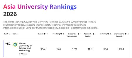 【本報訊】423日,英國泰晤士高等教育(TimesHigher EducationTHE)發佈“2026年度泰晤士亞洲大學排名”(THE Asia University Rankings 2026)。澳門科技大學位列亞洲第52名,較去年排名上升5名。