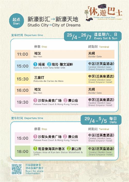 “‘休’遊巴士‧社區探趣”計劃由特區政府多個部門聯合推出,共設三個主題、六條路線、九個社區落客點,將於4月25日起正式試運行。計劃善用休企現有穿梭巴士資源,在途經社區增設合適站點,引導旅客深入探索地道美食、特色 店舖及豐富多元的本地人文風情。是次計劃沿線覆蓋超過一千家商戶,並結合 五一假期行人專用區、康公夜市等多項社區活動,有效盤活節假日及週末的社區人流,進一步刺激社區消費動力。