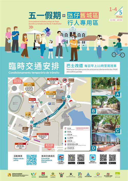 巴士服務方面,5月1日至4日每日早上11時至尾班車,氹仔舊城區四個巴士站將臨時停用,多條巴士路線需改道行駛,乘客可改用臨時站或周邊站點上落;另外,毗鄰關前後街區域的巴士路線則維持正常運作。因應節日期間新馬路的臨時巴士措施,5月1日至5日期間,途經草堆街的巴士路線全日實施臨時靠站安排。交通事務局已指示兩巴於客流高峰站點加強指示及增派人員協助分流乘客,並密切監測各站點候車情況,適時採取調度措施,確保公交交通有序運作。