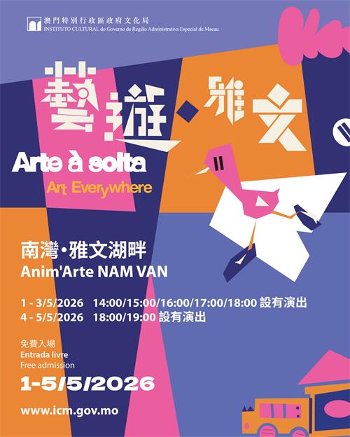 【本報訊】文化局將於5月1日至5日期間,在南灣‧雅文湖畔舉辦“藝遊雅文”活動,活動薈萃豐富多元的澳門特色演藝元素,讓公眾在五一假期沉浸在南灣湖畔悠閒雅致且熱鬧歡愉的節日氛圍中,近距離感受本澳的文化底蘊與藝文風采。活動免費入場,歡迎廣大市民及旅客參與。