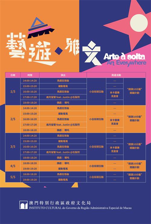 “藝遊雅文”將一連五天呈獻多場演藝節目,5月1日至3日每天下午2時至傍晚6時30分,安排5場特色展演;5月4日及5日傍晚6時至7時30分,則帶來2場精選演出。風格多樣的節目由本澳演藝精英呈獻,涵蓋“馬戲狂想曲”雜技展演、“躍動葡風”葡萄牙土風舞表演、“歲月留聲”流行歌曲演唱,以及偶劇《哪吒》等,為觀眾帶來豐富多彩的視聽體驗。