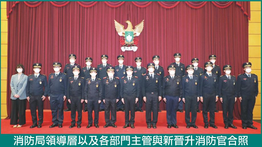 【本報訊】消防局於本年1月3日下午,在消防局總部暨西灣湖行動站舉行了副消防總長及一等消防區長晉升儀式。儀式由消防局局長梁毓森 消防總監主持,其他出席的官員還包括副局長 區耀榮及鄺逸富,以及各部門主管級官員。晉升儀式中,各領導分別為獲晉升的人員戴上新肩章,並送上熱烈祝賀。