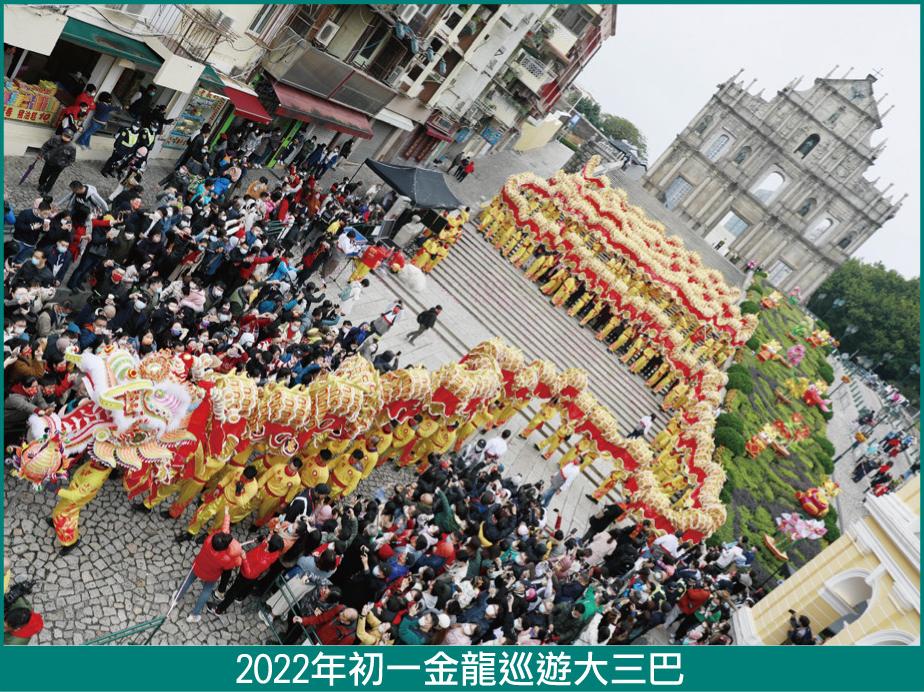 2022年大年初一,二百三十八米長的大金龍率先於大三巴牌坊向澳門居民和旅客拜年,並於澳門各個景區巡遊,寓意澳門在虎年朝氣蓬勃、欣欣向榮。財神、福祿壽三星、金童玉女、虎生肖及“麥麥”亦共同向市民和旅客拜年及派送金元寶,寓意澳門繁榮興旺、財源廣進。現場氣氛喜氣洋洋,各人互送祝福。及後的週末、五一黃金周都有所佳績。
