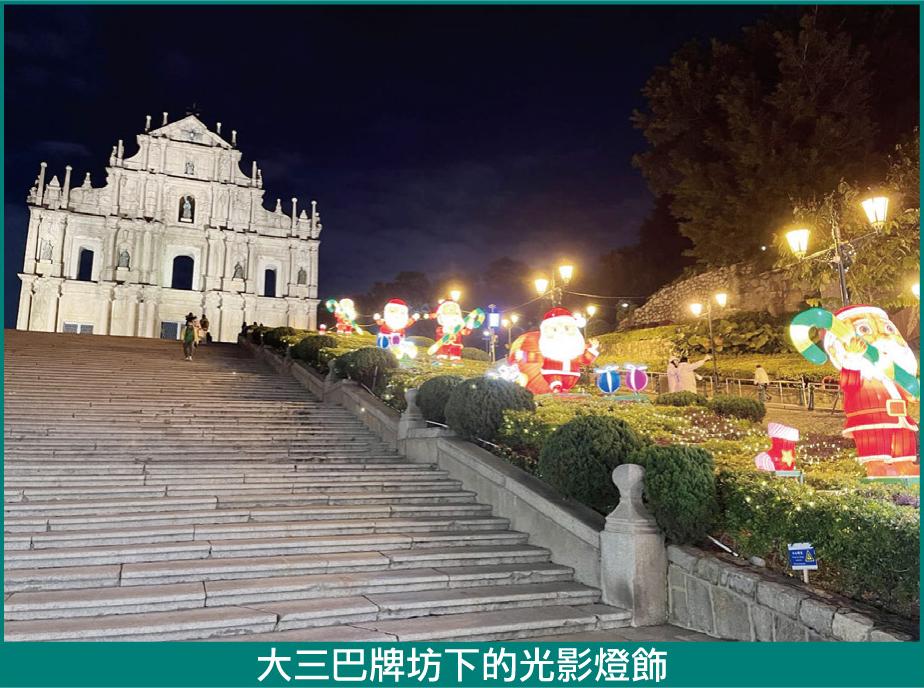 到了12月,以“閃亮冬日”為主題的幻彩耀濠江正式展開,大三巴也是其中一個覆蓋點,展出多款精美的燈飾,藉此善用澳門豐富的文化旅遊元素,透過“旅遊+”的跨界融合,結合公共藝術及創新科技點亮澳門,促進夜間經濟。