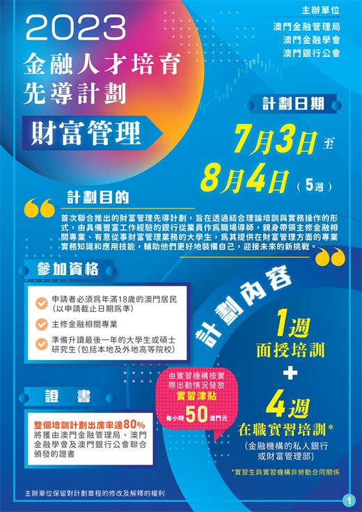 符合資格且有興趣的人士可於即日起至3月31日透過澳門金融學會進行報名,錄取名單將於5月下旬公佈。有關先導計劃的章程及報名詳情,可瀏覽隨附的宣傳海報。