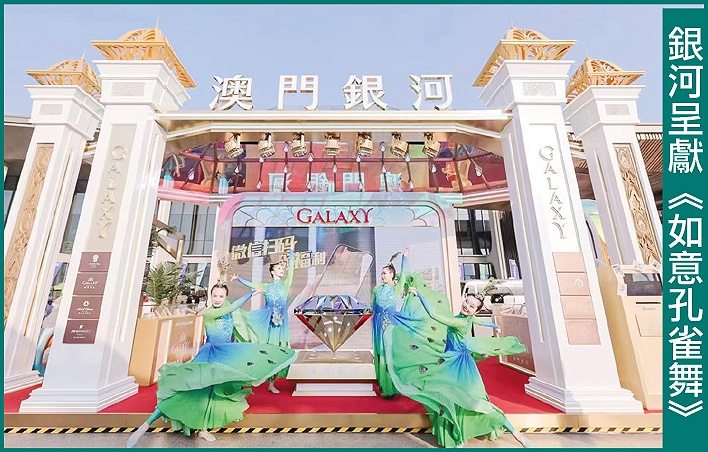“澳門銀河™”綜合度假城始終全力支持和參與澳門政府推廣活動,攜全新酒店產品歡迎天津市民到訪。活動期間,“澳門銀河”綜合度假城的展位展示標誌性的金色穹頂裝飾和運財銀鑽,令現場觀眾身臨其境般地近距離感受“澳門銀河”的恢弘氣派以及鑽石大堂高達3米巨鑽的璀璨閃耀。隨著澳門銀河 萊佛士的正式試業以及澳門安達仕酒店將於9月開幕,“澳門銀河”雲集了8家世界知名的奢華酒店品牌,賓客可以在展位一旁的打卡點前見證全球最多福布斯酒店獎項的榮耀。“童”在銀河的代表——孔雀“小淘淘”亦在活動現場與往來賓客歡樂互動,邀請賓客在度假城極受歡迎的標誌性設施——天浪淘園前合影,並可即場列印相片,放進“澳門銀河”特別設計的相框,記載難忘的活動時刻。“澳門銀河”更於現場舞台呈獻了精彩絕倫的《如意孔雀舞》表演。孔雀元素在度假城內隨處可見,象徵著吉祥與幸運,從具有代表性的孔雀元素到金碧輝煌的建築裝飾,“澳門銀河”的華美韻味在唯美舞姿之中展現得淋漓盡致。