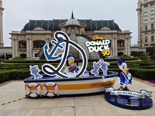 在上葡京“綠茵勝境”花園展示的唐老鴨及立體船裝置
