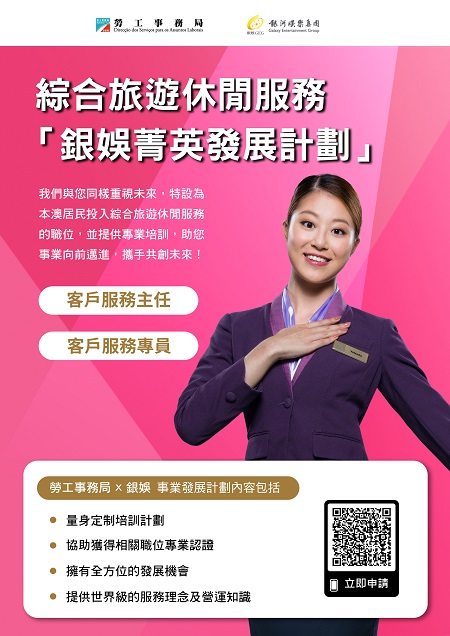 【本報訊】為支持本地人才全面發展,拓展多元職涯路向,勞工事務局和銀河娛樂集團(下稱“銀河娛樂")合作推出「銀娛菁英發展計劃(綜合娛樂服務範疇)」及「銀娛菁英發展計劃(保安服務範疇)」,以“先入職、後培訓”方式,為有志投身綜合旅遊休閒服務行業的澳門居民提供全方位培訓及事業發展機會,計劃由4月17日起接受申請。