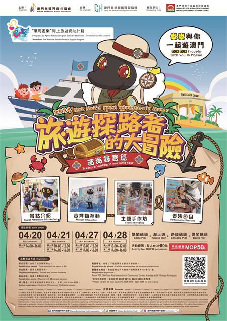 “旅遊探路者的大冒險—濱海尋寶篇”結合海上遊、景點介紹和尋寶解謎等元素。主辦單位安排於4月20、21、27及28日一連兩個週六日,合共提供7班航班,從媽閣碼頭出發,經海上遊航線前往路環碼頭。活動以澳門旅遊吉祥物“麥麥”的尋寶遊歷作主軸,帶來互動遊戲、主題手作、兒童繪本共讀會以及舞蹈或魔術表演等,並邀請專業導賞員於船上講解澳門歷史故事。